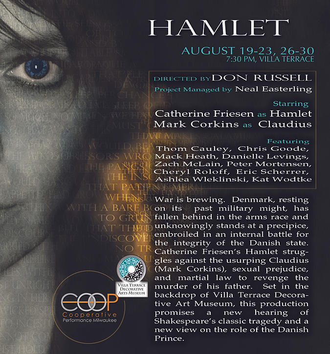 Cooperative Performance Milwaukee is shiny, new outfit that emerged just a little while ago. It will be staging a production of Hamlet to the Villa Terrace Decorative Arts MuseumAugust 19th-30th. Cooperative Performance Milwaukee co-founder Don Russell directs the play, which stars Catherine Friesen in the title role . . . an interesting cross-gender choice there . . . Other notable names that stick out at me from the cast are Thom Cauley as Laertes, Mark Corkins as Claudius, Mack Heath as Polonius and Cheryl Roloff as Gertrude.